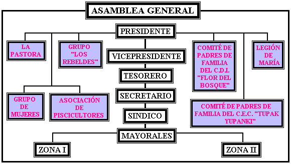 2. SUBORGANIZACIONES INTERNAS.- Para poder fortalecer efectivamente a la comunidad, el cabildo, con la colaboración de sus moradores han estructurado diferentes suborganizaciones como: Grupo de Mujeres, Grupo de Jóvenes "los rebeldes", Grupo de Catequesis, Legión de María, Comité de Padres de la Guardería "Flor del Bosque", Comité de Padres de Familia del Centro Educativo Comunitario "Tupac Yupanqui", y la Organización de la Pre-asociación de Piscicultores.